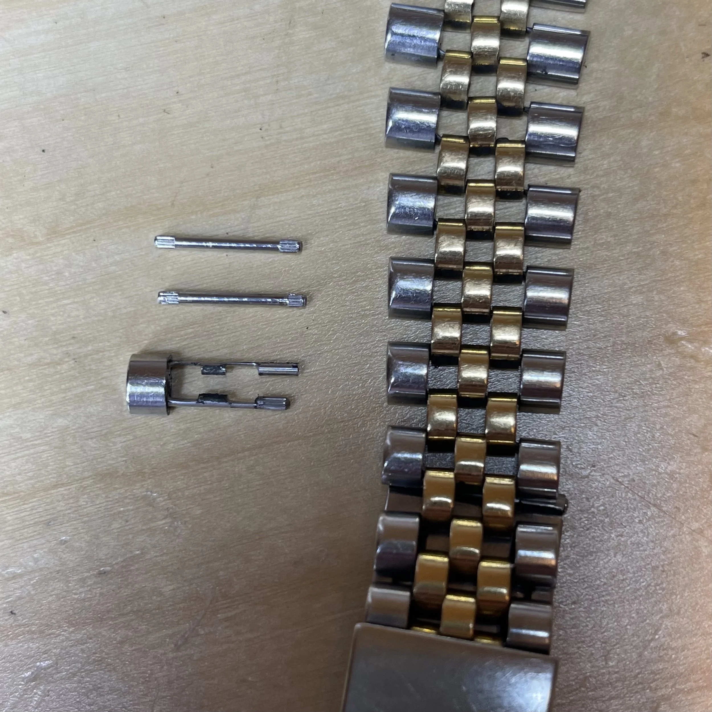 I also offer bracelet refurbishment, or "re-pin”. Over time certain watch bracelets can become worn and stretched, and these pins can be removed and replaced.